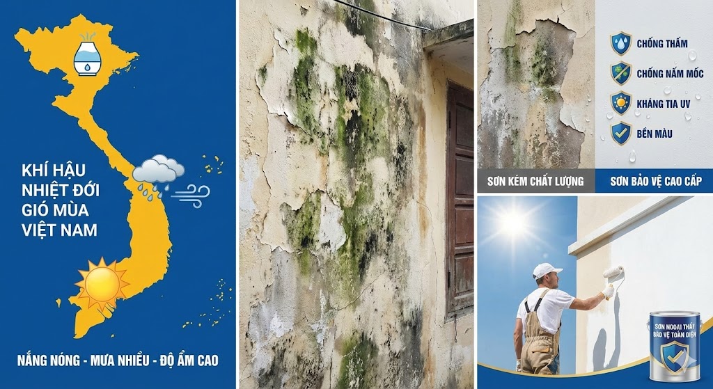 Việt Nam thuộc khí hậu nhiệt đới gió mùa, nhiệt độ trung bình năm cao, độ ẩm thường xuyên trên 80% và mưa bão nhiều, khiến tường dễ ẩm, thấm nước, mốc và bong tróc nếu dùng sơn kém chất lượng. Ở miền Bắc còn có giai đoạn nồm ẩm, miền Trung nắng nóng gió Lào, miền Nam nắng nhiều mưa lớn, làm lớp sơn nhanh lão hóa, phai màu và rạn nứt.