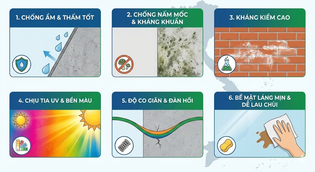 Khi chọn sơn nước cho nhà ở, công trình tại Việt Nam, nên tập trung vào các tiêu chí kỹ thuật sau: