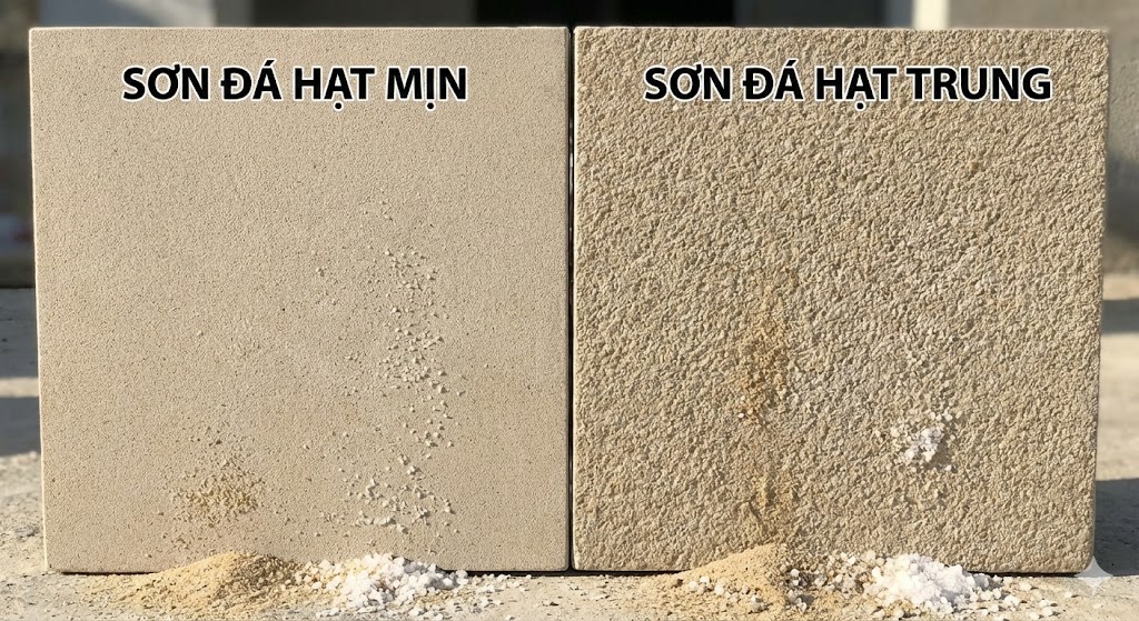 → Sơn đá hạt trung hoặc hạt mịn là tối ưu; hạt quá to thường bám muối, dễ ố vàng theo thời gian.