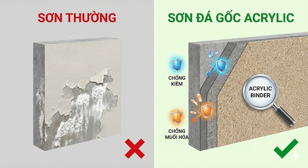 Khu vực ven biển yêu cầu độ bền cao và khả năng kháng muối. Sơn đá hệ Acrylic có: