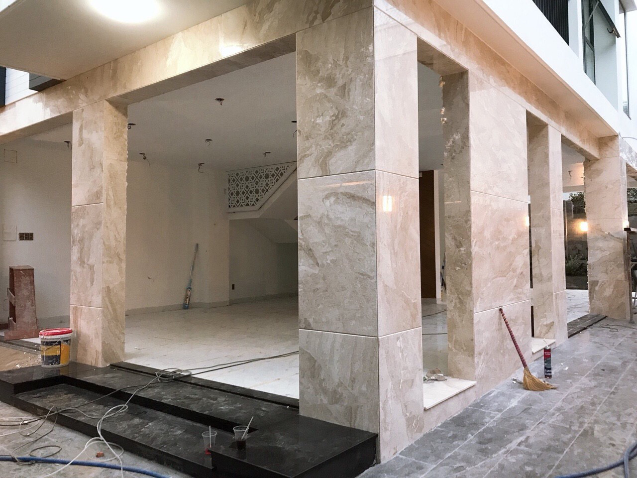 Ốp đá thật là việc sử dụng các loại đá tự nhiên (granite, marble, travertine,…) được cắt, mài và ốp trực tiếp lên bề mặt tường.